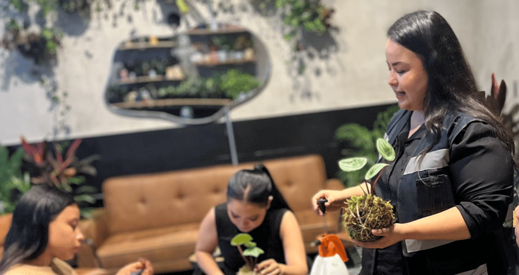 Durante el proceso, se brindó atención personalizada para la elaboración correcta de una kokedama, desde la elección adecuada de la planta a usar hasta la técnica correcta para envolverla con hilo. Al finalizar, se les dió una bebida de cortesía a cada uno de los participantes como parte de los beneficios que ofrece el taller.